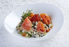 265 г • форель с/с, икра красная, корень сельдерея, огурец св., морковь, авокадо, зеленый горошек, яйца, майонез