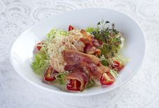 205 г • креветки королевские, салат микс, жареный бекон, свежие томаты, свежие огурцы, семена кунжута, соус «Цезарь»