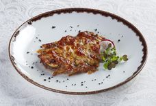 250 г • запеченный из отварного картофель, с зажаркой из грудинки к/в и лука
