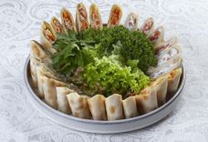 500 г • рулетики из лаваша с ассорти начинок (форель с/с и сыр фета, морковь пряная и ветчина, филе цыплят с сыром и маринованными огурчиками, пряная морковь и крабовые палочки)