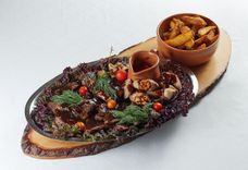 900/130/300/100/50/32 г • приготовленные на гриле свиная вырезка, говяжья вырезка, филе куриное и колбаски по-домашнему, соус деми гляс, картофельные дольки фри, кетчуп, помидорки черри, зелень