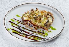 350 г • драники, жареные боровики с луком, сливочный соус, зелень