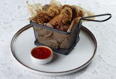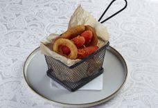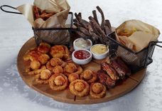 280/200/130/130/100/50/50/50/50/50/50 г • куриные крылья в медово-горчичной глазури, луковые кольца фри, сырные шарики с тмином, сырные шарики с халапеньо, чесночные гренки, наггетсы куриные, картофель фри, соус сырный, соус острый чили, соус прованский