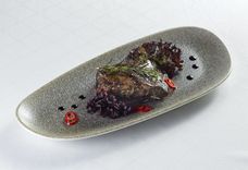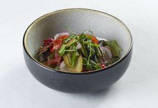 145 г • спаржа, кальмары, огурцы св., перец св., морковь пряная, лук порей, соус сладкий чили, кунжут
