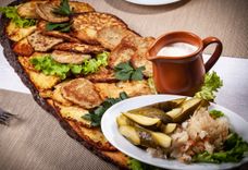 900/150/150/200 г • Большой сет из драников, квашеная капуста, маринованные огурчики, сметана, зелень