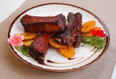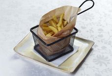 170/150/260 г • жареная отбивная из свинины, картофельные дольки фри, свежий салат из огурцов, томатов, репчатого лука, заправленный сметаной