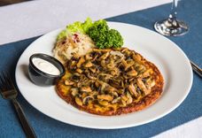 350 г • драники, жареные боровики с луком, сливочный соус, зелень