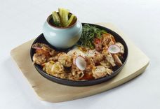 900/130/300/100/50/32 г • приготовленные на гриле свиная вырезка, говяжья вырезка, филе куриное и колбаски по-домашнему, соус деми гляс, картофельные дольки фри, кетчуп, помидорки черри, зелень