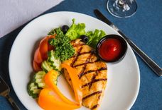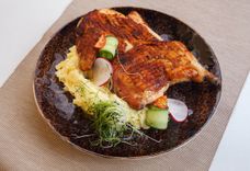 500/180 г • цыпленок табака, пюре картофельное, помидор черри