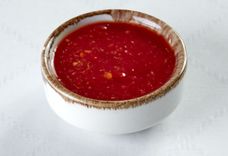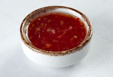 220 г • спелые томаты, хрустящие обжаренные баклажаны, салатный микс, чесночный мягкий сыр, заправленый кисло-сладким соусом