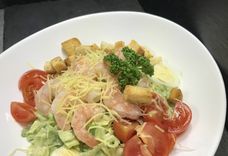 220 г • микс салатов, яйца перепелиные, пармезан, гренки, черри, фирменный соус «Цезарь», зелень