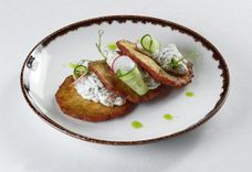 280 г • хрустящие драники с сырным кремом, форель с/с, св. зелень, св. огурец
