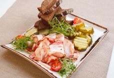 330/100 г • грудинка соленая, грудинка к/в, огурец маринованный, хлеб, чеснок, лук зеленый, горчица столовая