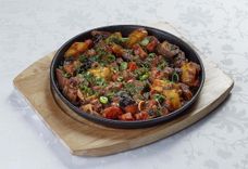 390 г • жаркое из картофеля, баклажана, моркови, с томатами, чесночком и специями, запеченное с языком и беконом