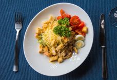 210 г • жареное куриное филе, ветчина, грибы, баклажаны, сыр, салат, помидоры, соус-коктейль