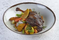 150/160 г • томленный утиный окорочок в яблоках, подается с овощами на гарнир: морковь мини, брокколи, картофель, цветная капуста, морковь «йеллоустоун», специи