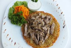 275 г • Хрустящие драники, подаются с обжаренными в нежном соусе курицей и грибами